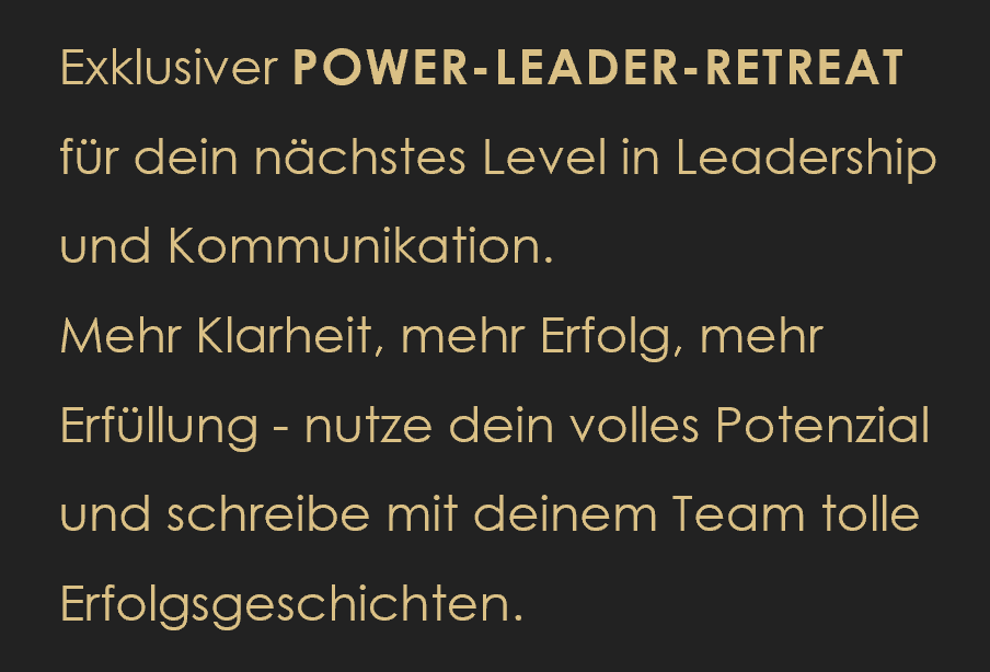 - Unser exklusiver POWER-LEADER-RETREAT in Leadership und Kommunikation richtet sich an Führungskräfte, die sich wirkungsvolle Impulse für ihre Führungspraxis holen möchten.